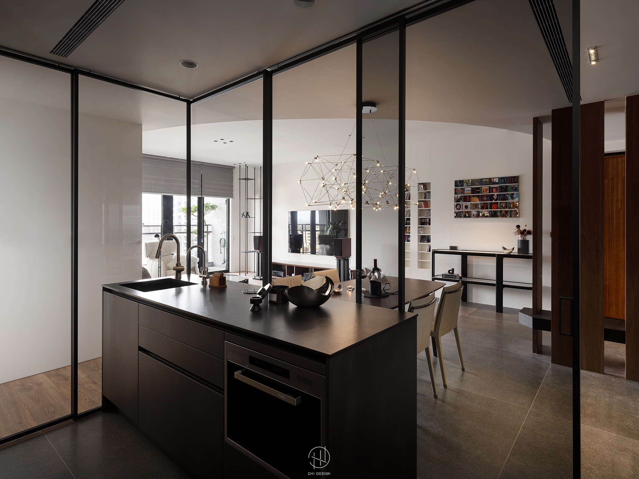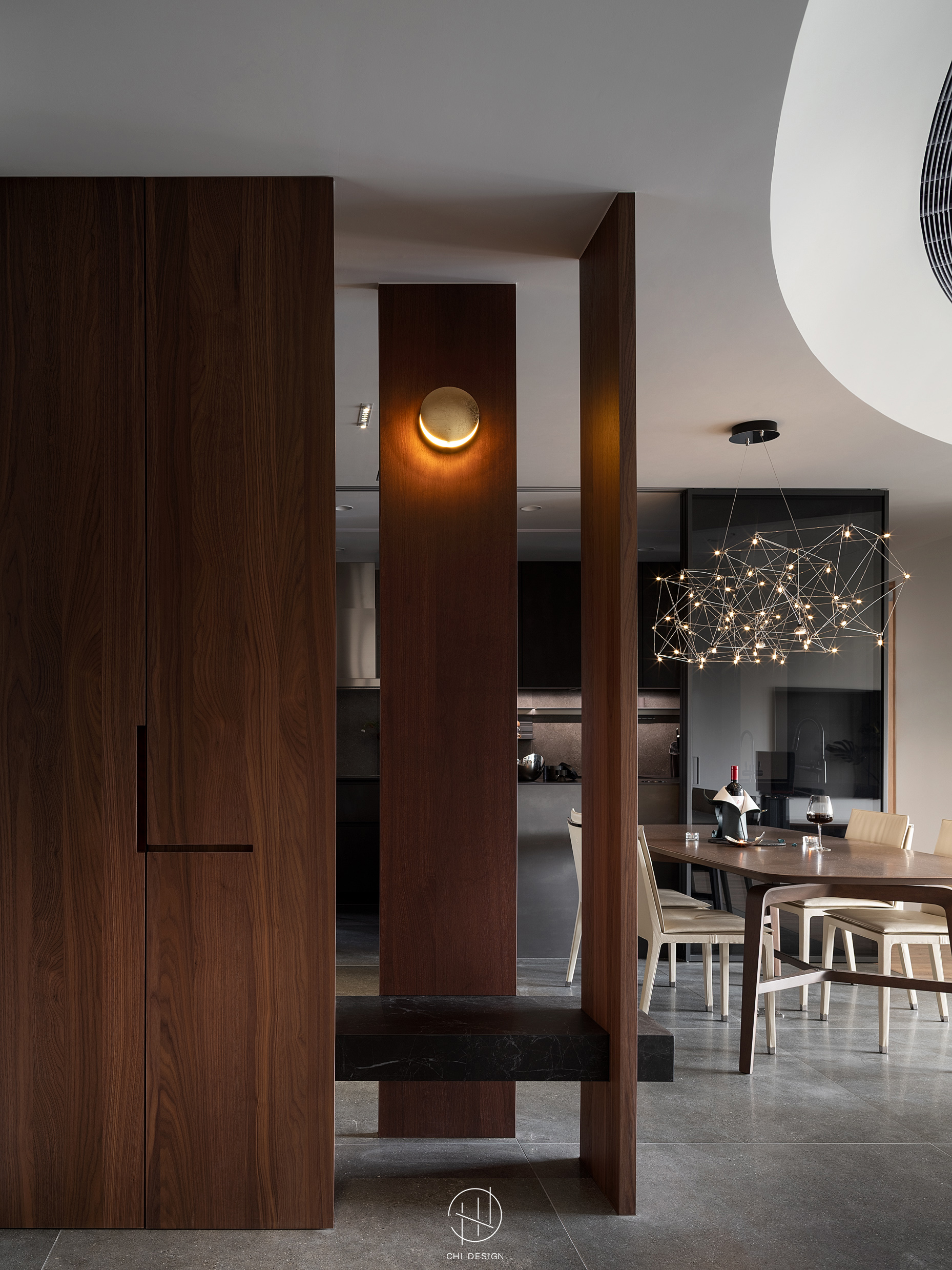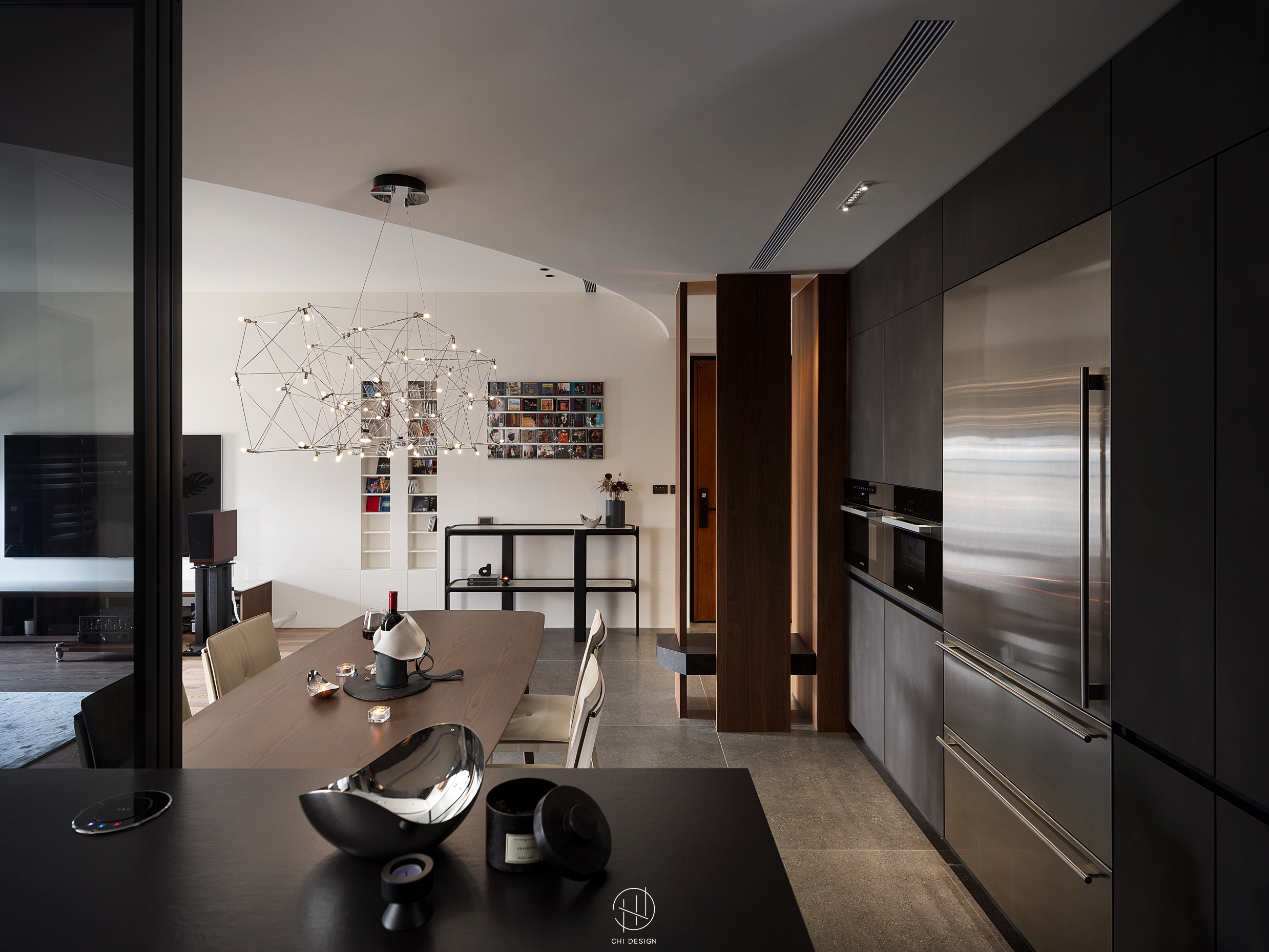 水平與垂直線條的理性鋪陳出空間中的秩序,深色木皮與石材拼接於垂直立面,對應天花與地坪的水平層次,交織出穩定、沉著的情緒感受,中島與餐桌並行配置,佐以幾何吊燈與間接照明,營造出節奏井然的生活舞台。