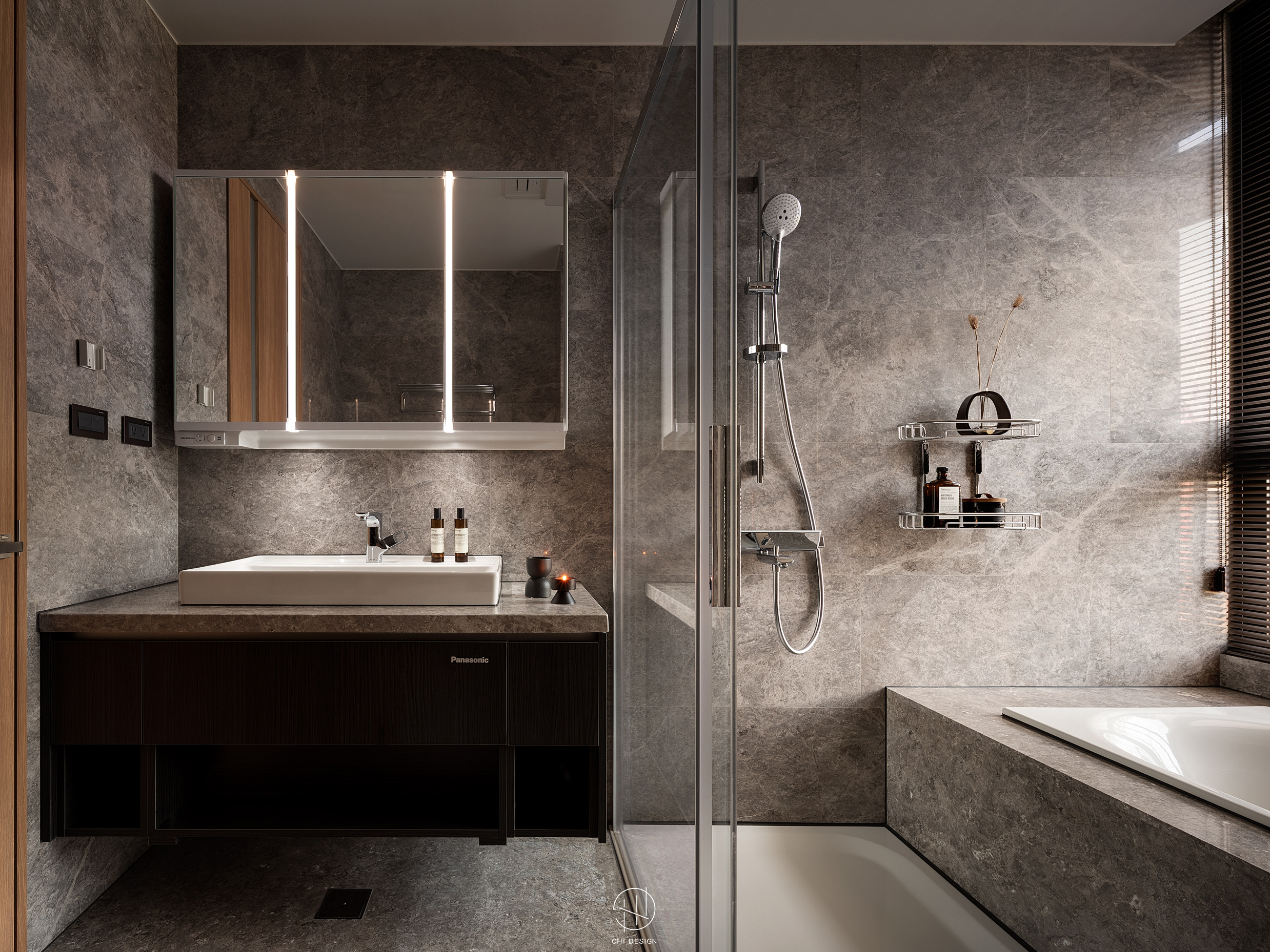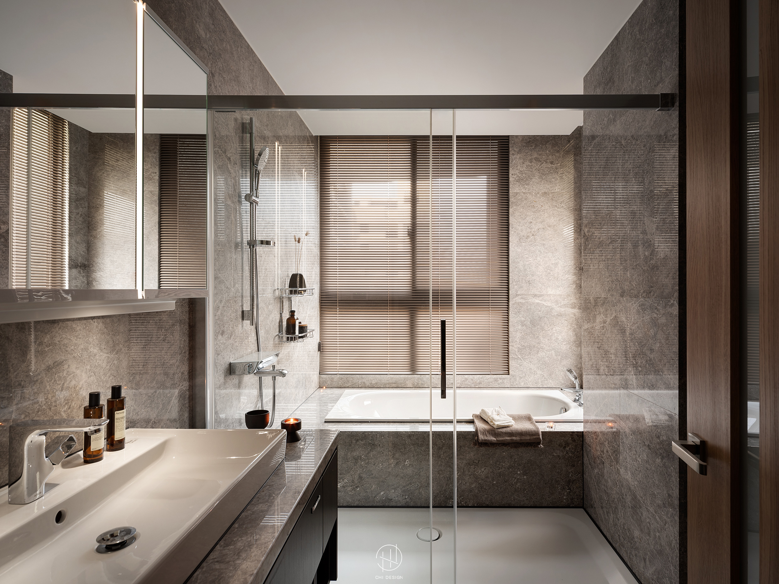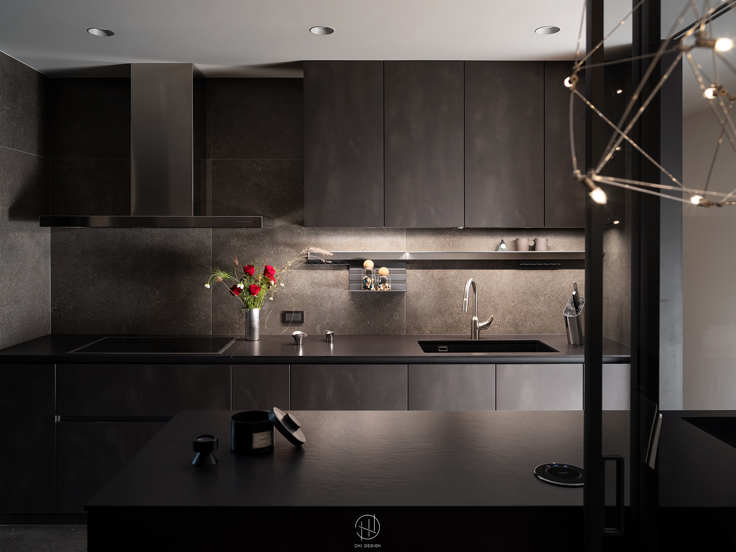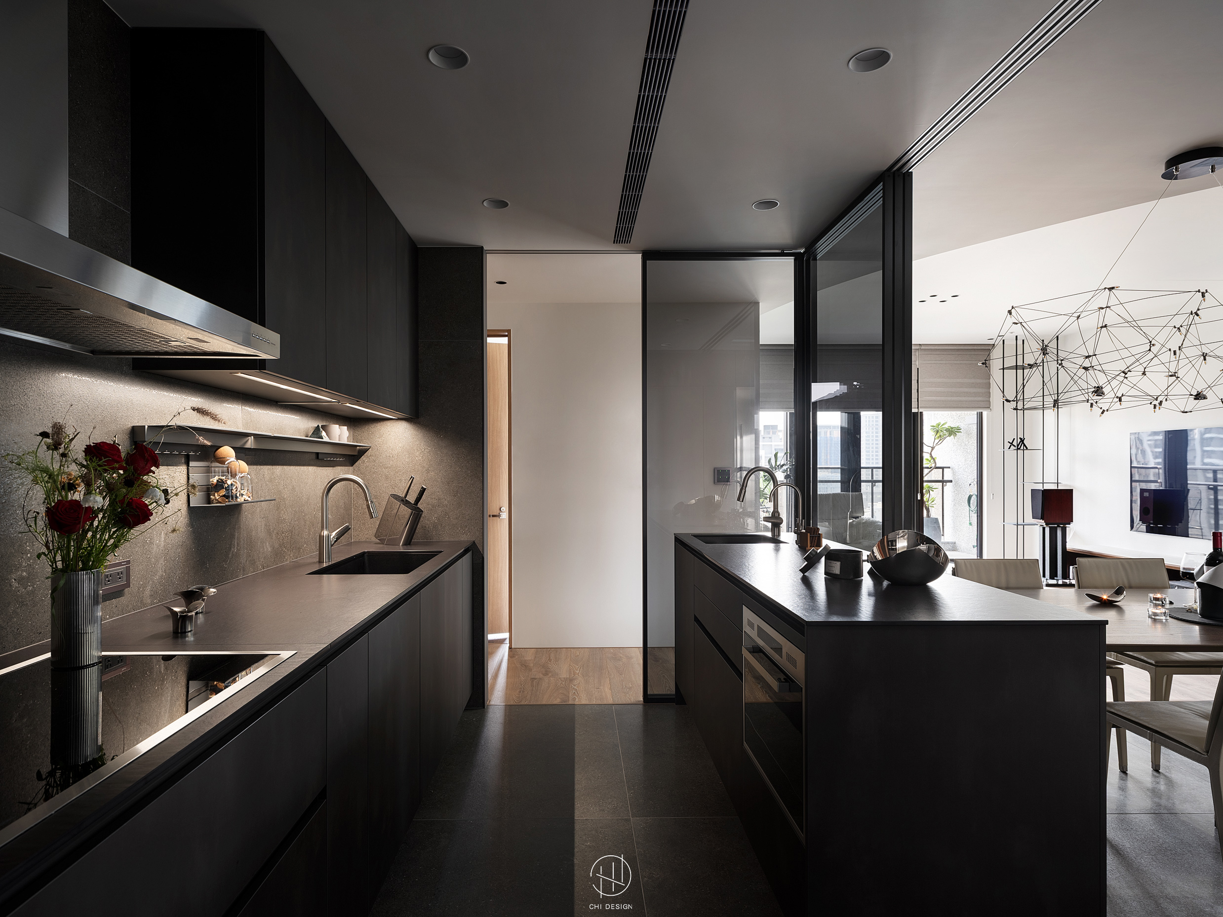 水平與垂直線條的理性鋪陳出空間中的秩序,深色木皮與石材拼接於垂直立面,對應天花與地坪的水平層次,交織出穩定、沉著的情緒感受,中島與餐桌並行配置,佐以幾何吊燈與間接照明,營造出節奏井然的生活舞台。