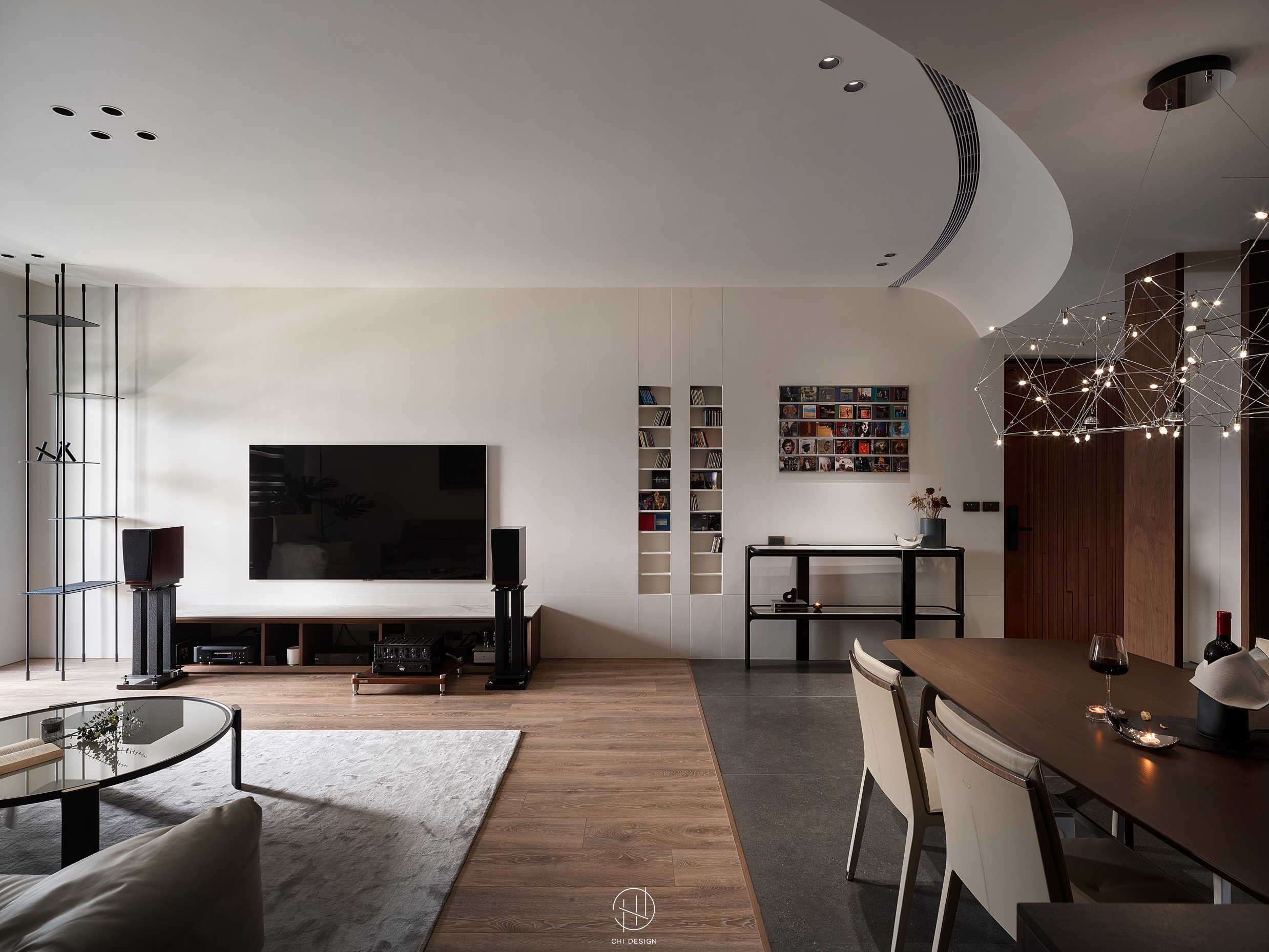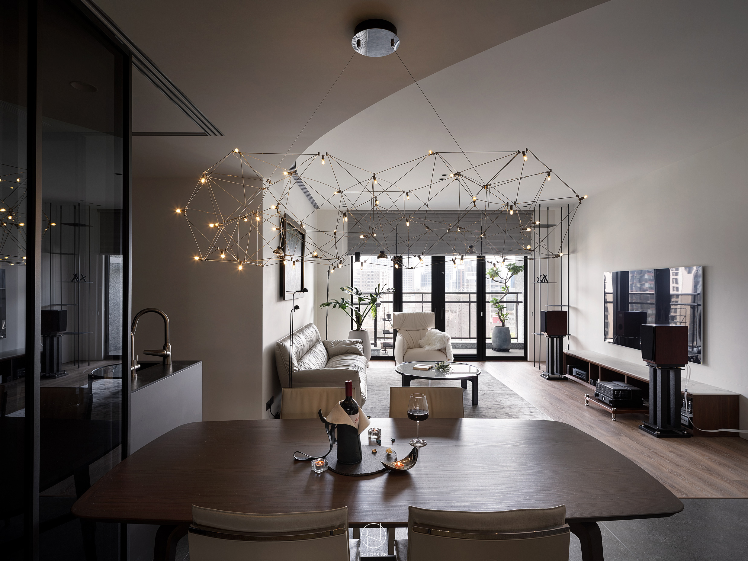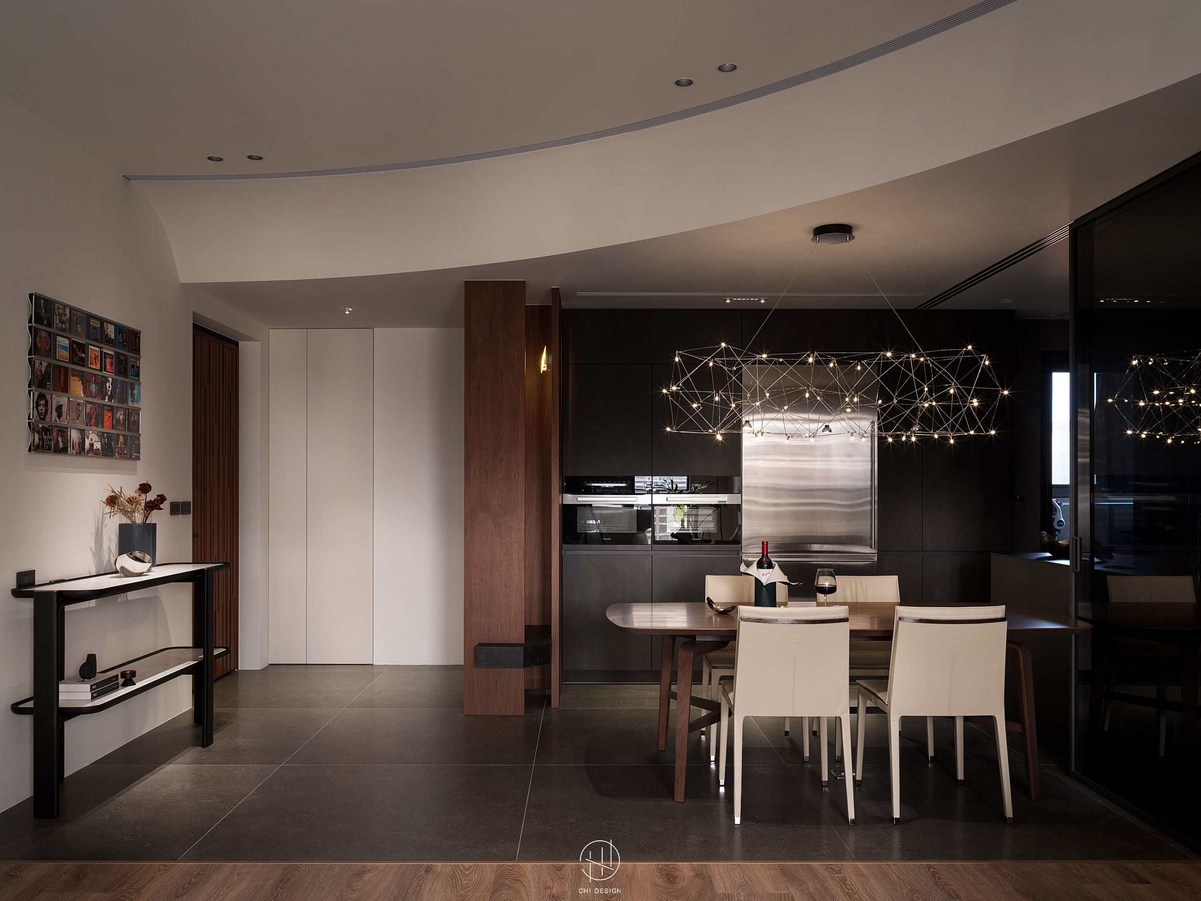 當陽光升起,柔和的光影與弧形輪廓,輕輕拉開屬於2人生活的序幕,曲線天花劃過天際,勾勒出流動節奏;細膩的圓弧語彙,貫穿客廳、餐廳與廚房動線,使空間宛如一首交響樂前的慢板,引領步伐進入恬靜、溫柔的日常。